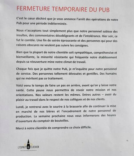 Une microbrasserie de Neuville a pris la décision, hier, de suspendre les activités de son pub à bières en raison d’une clientèle récalcitrante qui s’obstine à ne pas suivre les règles imposées par la santé publique.
